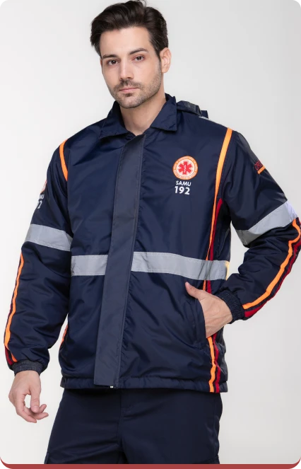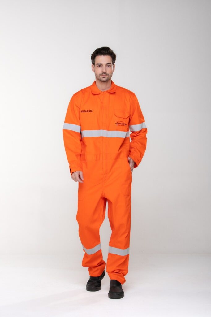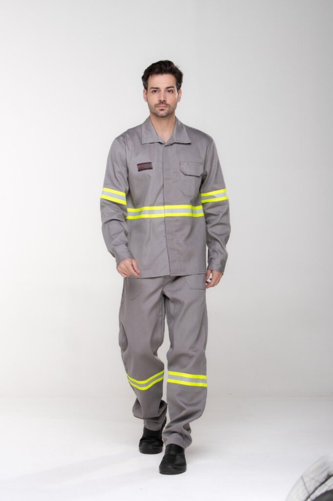 Conjunto de segurança confeccionado em tecido de proteção, projetado para oferecer segurança em
